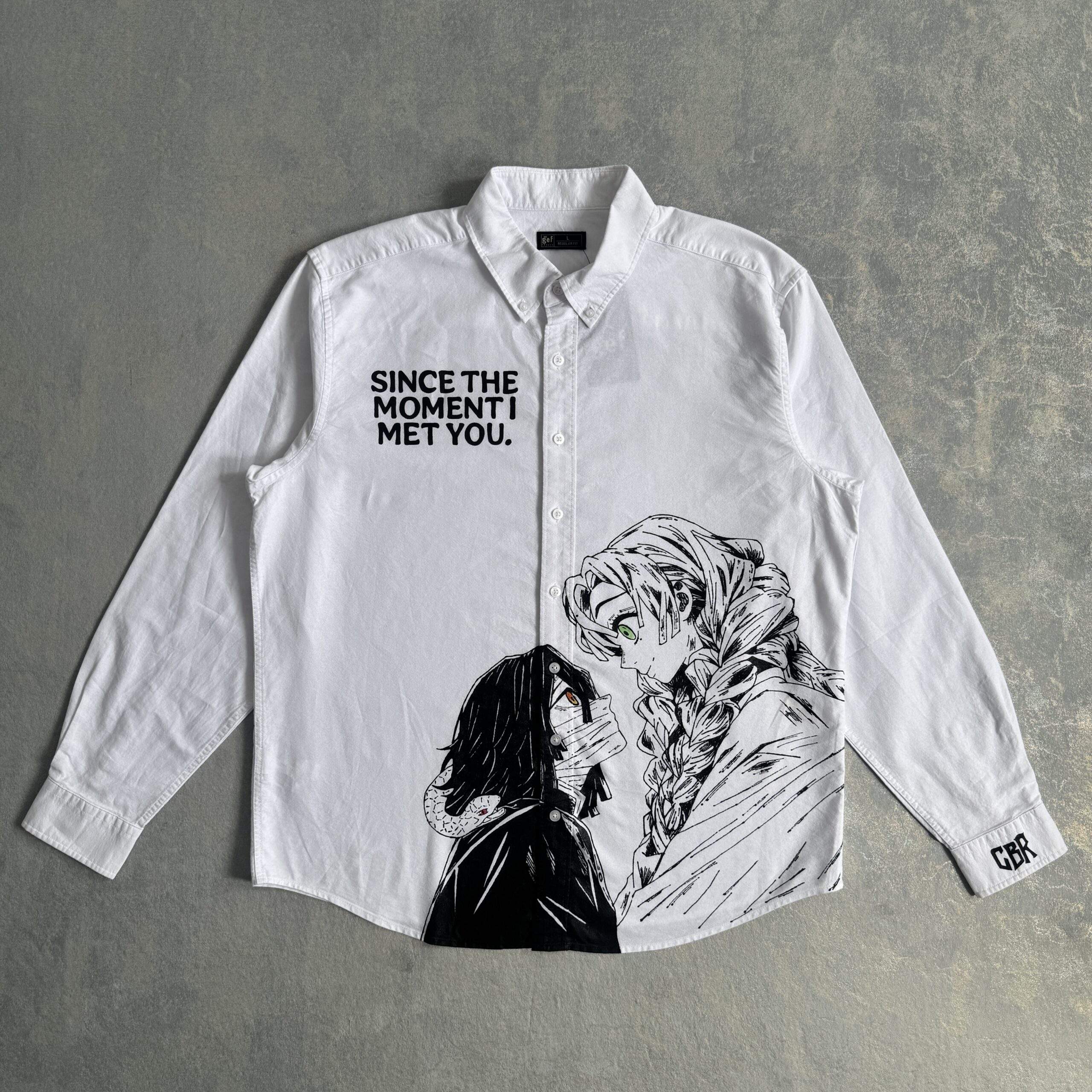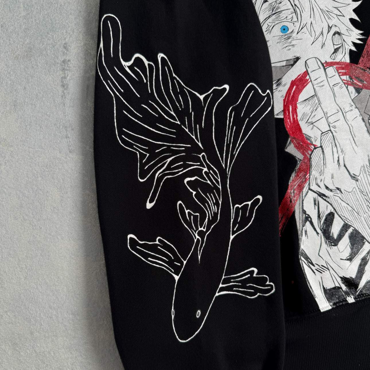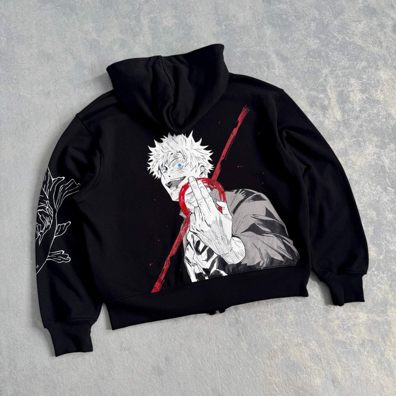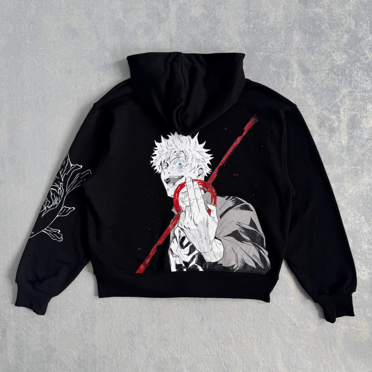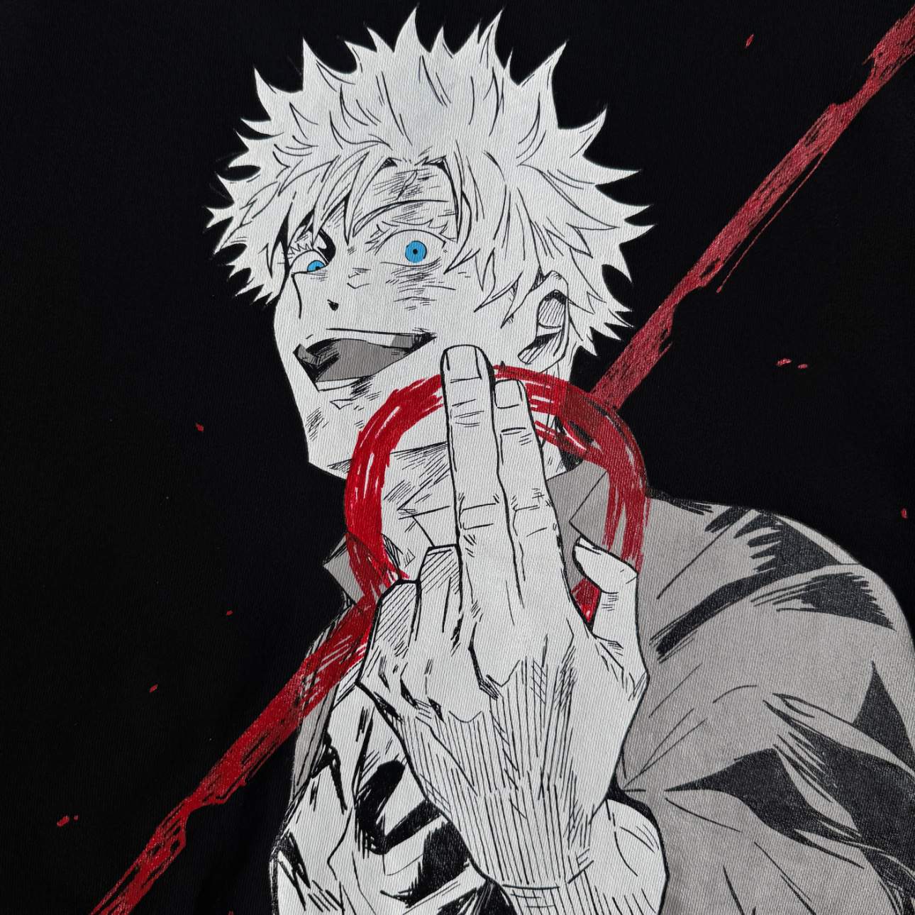 Diseño inspirado en Gojo Satoru, intervenido a mano con detalles en la parte frontal y la manga.